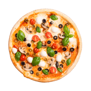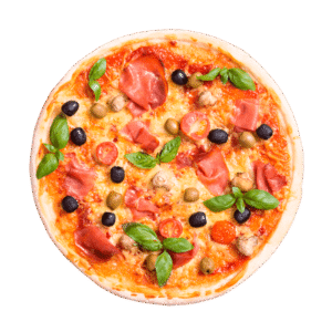 Sauce tomate, mozzarella, jambon, champignons, artichauts et olives.